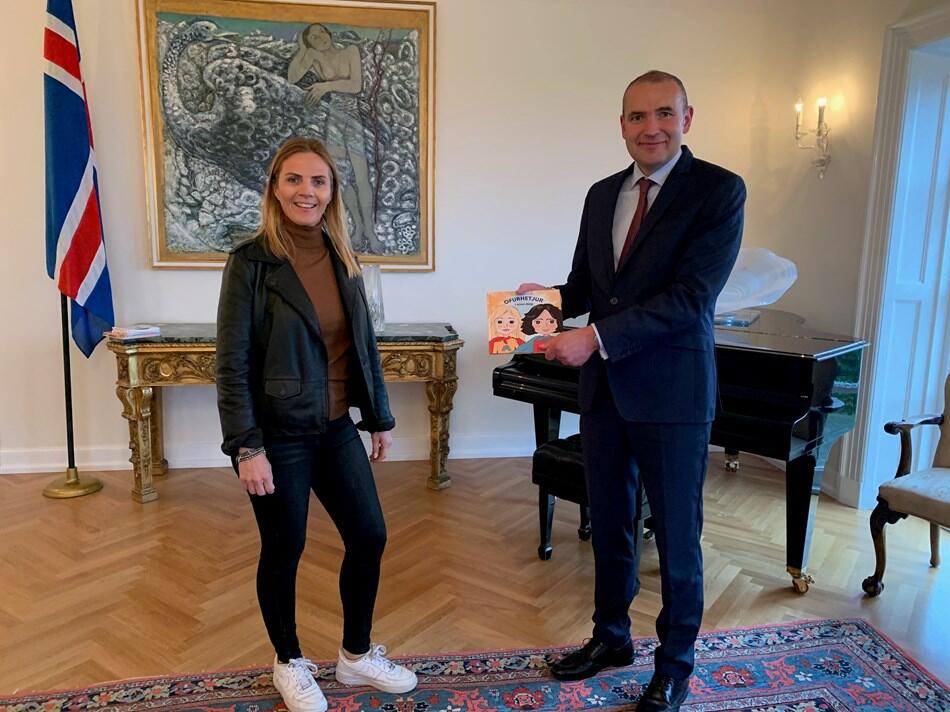 Forseti tekur á móti bók að gjöf. Anna Steinsen, tómstunda- og félagsmálafræðingur, samdi og gaf út barnabókina Ofurhetjur í einn dag. Allur ágóði af sölu hennar rennur til UN Women á Íslandi.