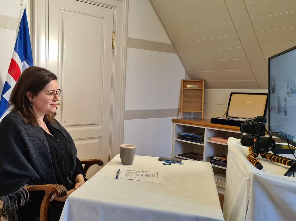 Eliza Reid forsetafrú ræðir við nemendur í Tunxis Community College í Connecticut, í tilefni af Alþjóðlegum baráttudegi kvenna 8. mars og Women's History Month í Bandaríkjunum. Til umræðu var jafnrétti kynjanna. Að loknu erindi tók forsetafrú við ýmsum spurningum um stöðu jafnréttismála á Íslandi. Sökum heimsfaraldurs hefur kennsla við Tunxis Community College farið alfarið fram á netinu síðan í mars 2020.