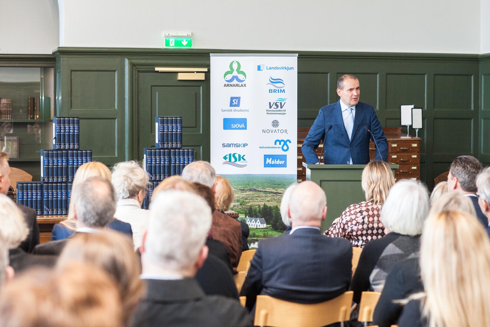 Forseti flytur ávarp við hátíðlega athöfn í Þjóðmenningarhúsinu í Reykjavík. Þar voru 550 eintök af heildarútgáfu Íslendingasagnanna formlega afhent menningar- og viðskiptaráðherra. Þeim verður síðan dreift til bókasafna, skóla, heilbrigðisstofnana og annarra staða um landið allt. Saga forlag gefur verkið út og naut það atbeina fjölmargra stórfyrirtækja og samtaka. Í máli sínu minnti forseti á mikilvægi þess að miðla sagnaarfi Íslendinga til nýrra kynslóða á fjölbreytta vegu, tengja fortíð við samtíma og láta ferska vinda blása um þessi miklu þjóðarverðmæti, merkasta framlag Íslands til heimsmenningarinnar. Meðal viðstaddra voru Vigdís Finnbogadóttir, Lilja Alfreðsdóttir ráðherra, Jóhann Sigurðsson, framkvæmdastjóri Saga forlags, Ingibjörg Sverrisdóttir landsbókavörður og fulltrúar styrkjenda.