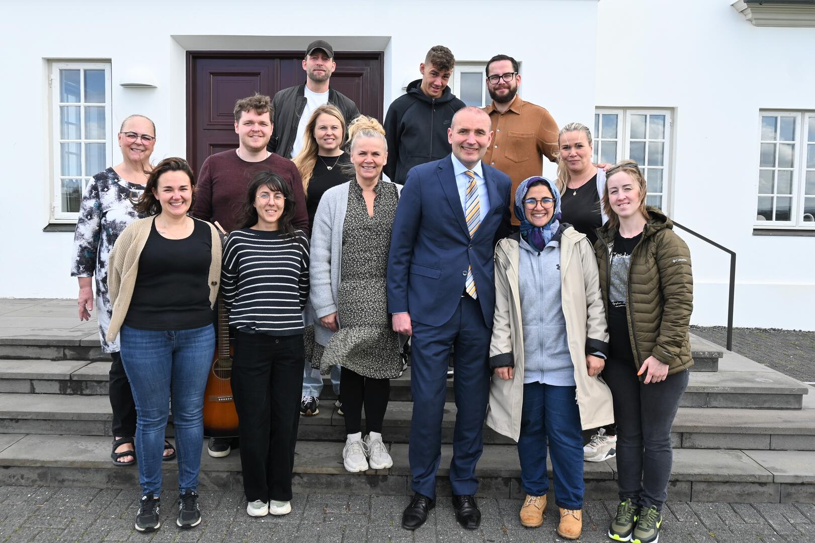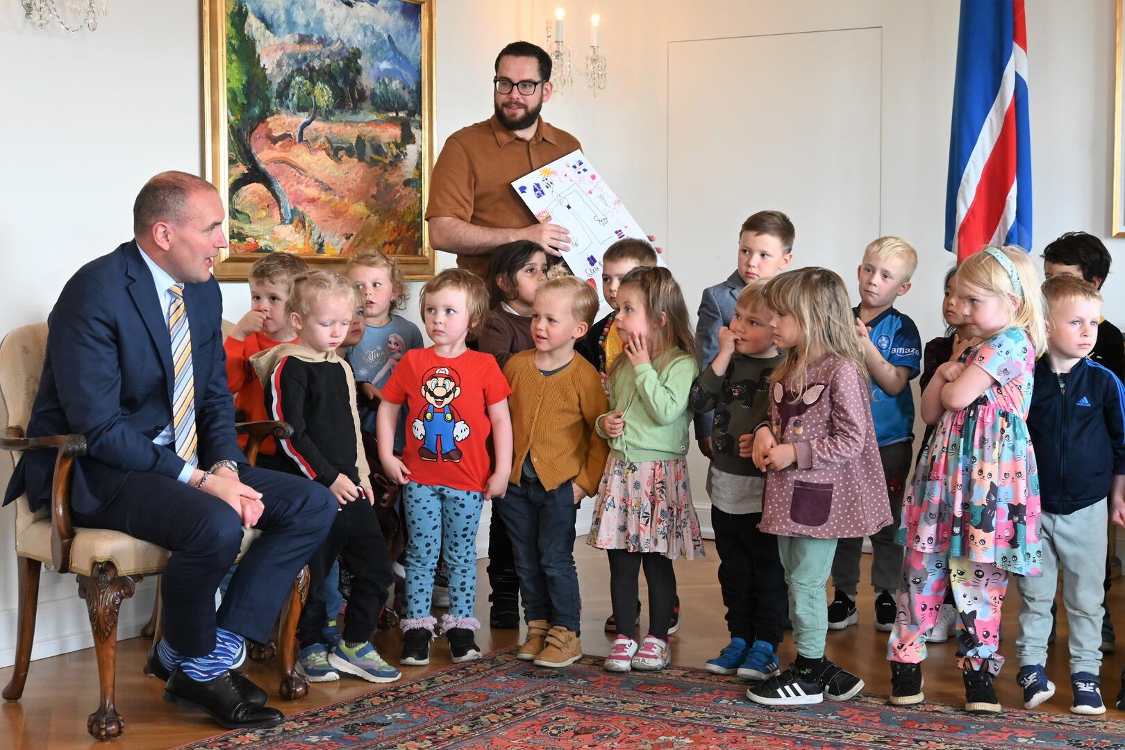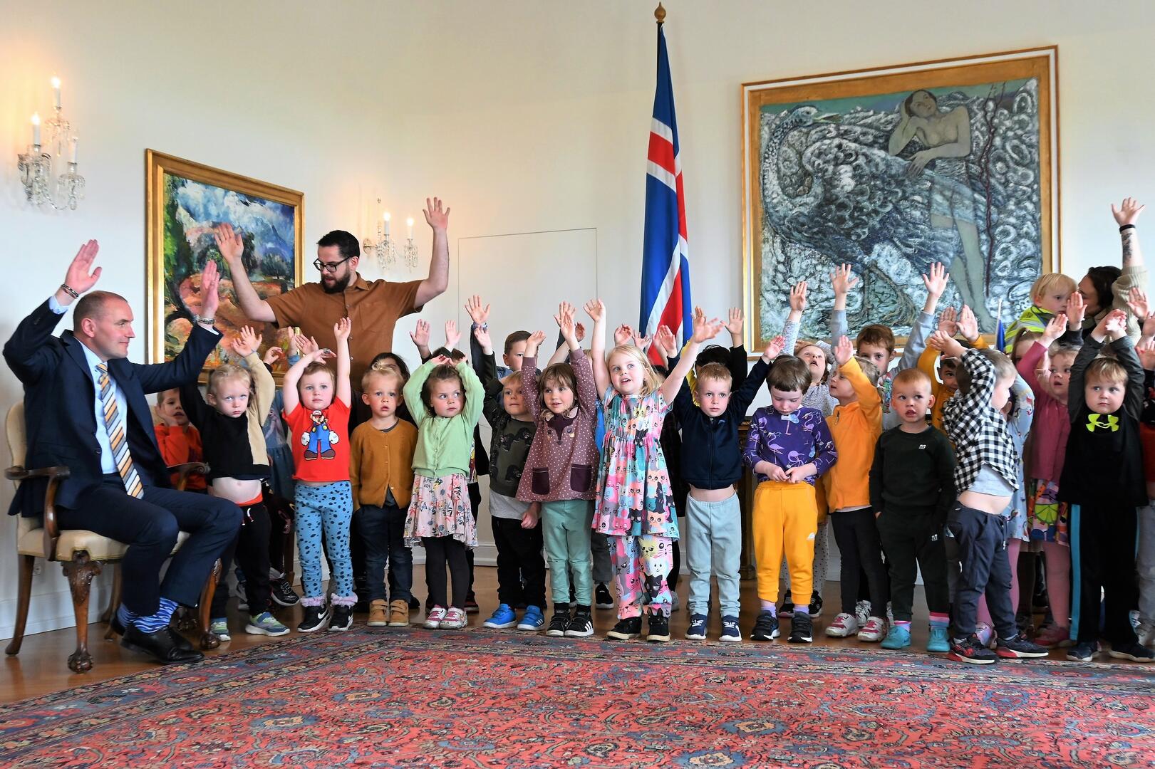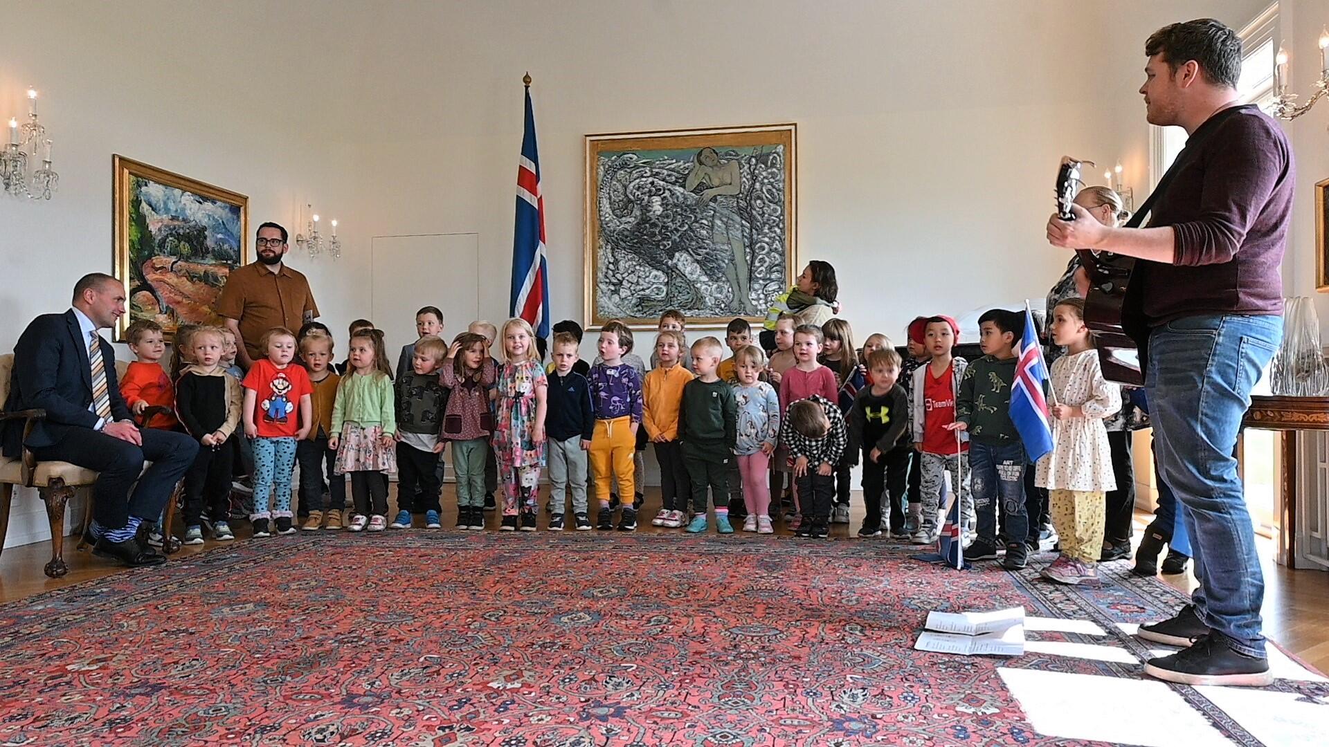 Forseti tekur á móti börnum frá leikskólanum Sunnuási úr Hlíðahverfi Reykjavíkur og kennurum þeirra. Börnin sungu tvö lög fyrir forseta, þar á meðal afmælissönginn því heimsóknina bar upp á afmælisdag forseta.