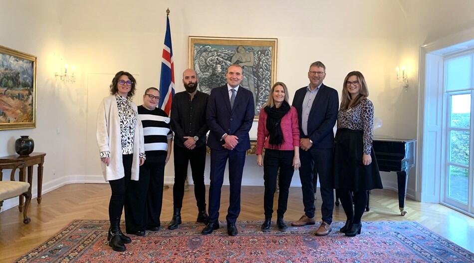Forseti tekur á móti fulltrúum Einhverfusamtaka Rúmeníu. Þeir eru hér að kynna sér líf og aðstöðu einhverfra á Íslandi. Gestirnir njóta aðstoðar og liðveislu Bjarndísar Arnardóttur og Bjarna Torfa Álfþórssonar hjá samtökunum Specialisterne á Íslandi.