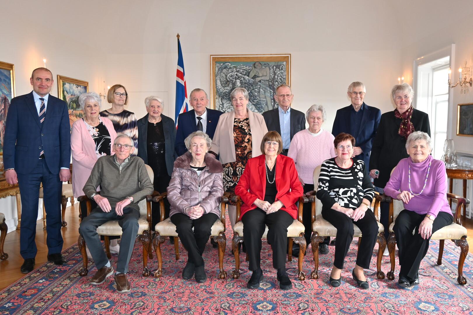 Síðdegis tók forseti á móti gestum dagdvalarinnar Víðihlíð í Grindavík. Líkt og aðrir Grindvíkingar hafa þau ekki getað búið á eigin heimili þar síðustu mánuði en heimsóttu Bessastaði á 50 ára kaupstaðarafmælinu, þáðu kaffiveitingar og kynntu sér sögu staðarins.