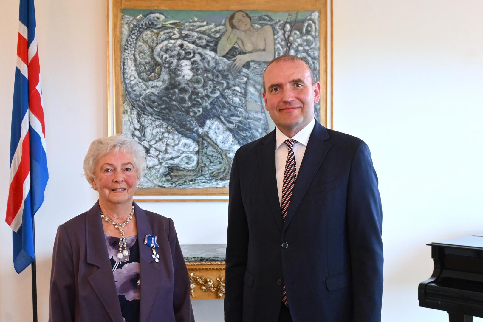 Tveir orðuhafar voru staddir erlendis, þær Dísella Lárusdóttir og Margrét Vilborg Bjarnadóttir, og taka þær við orðunni við fyrsta tækifæri.