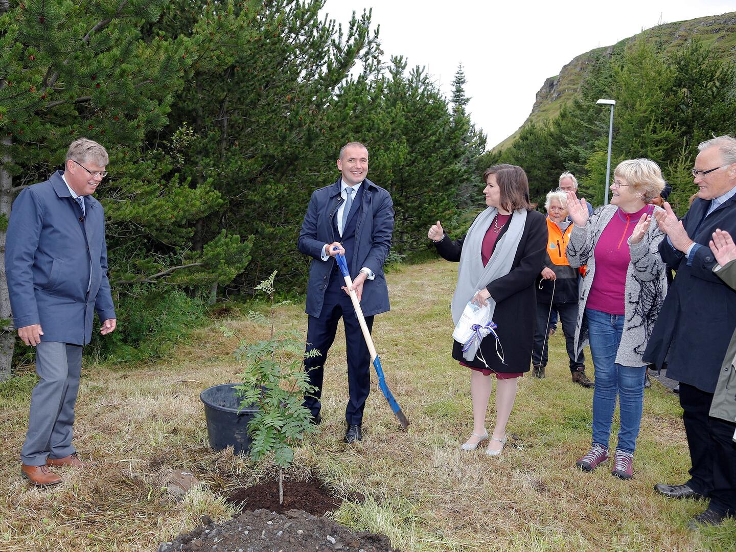 Forseti gróðursetur reynitré í skógrækt Mosfellinga við Úlfarsfell.