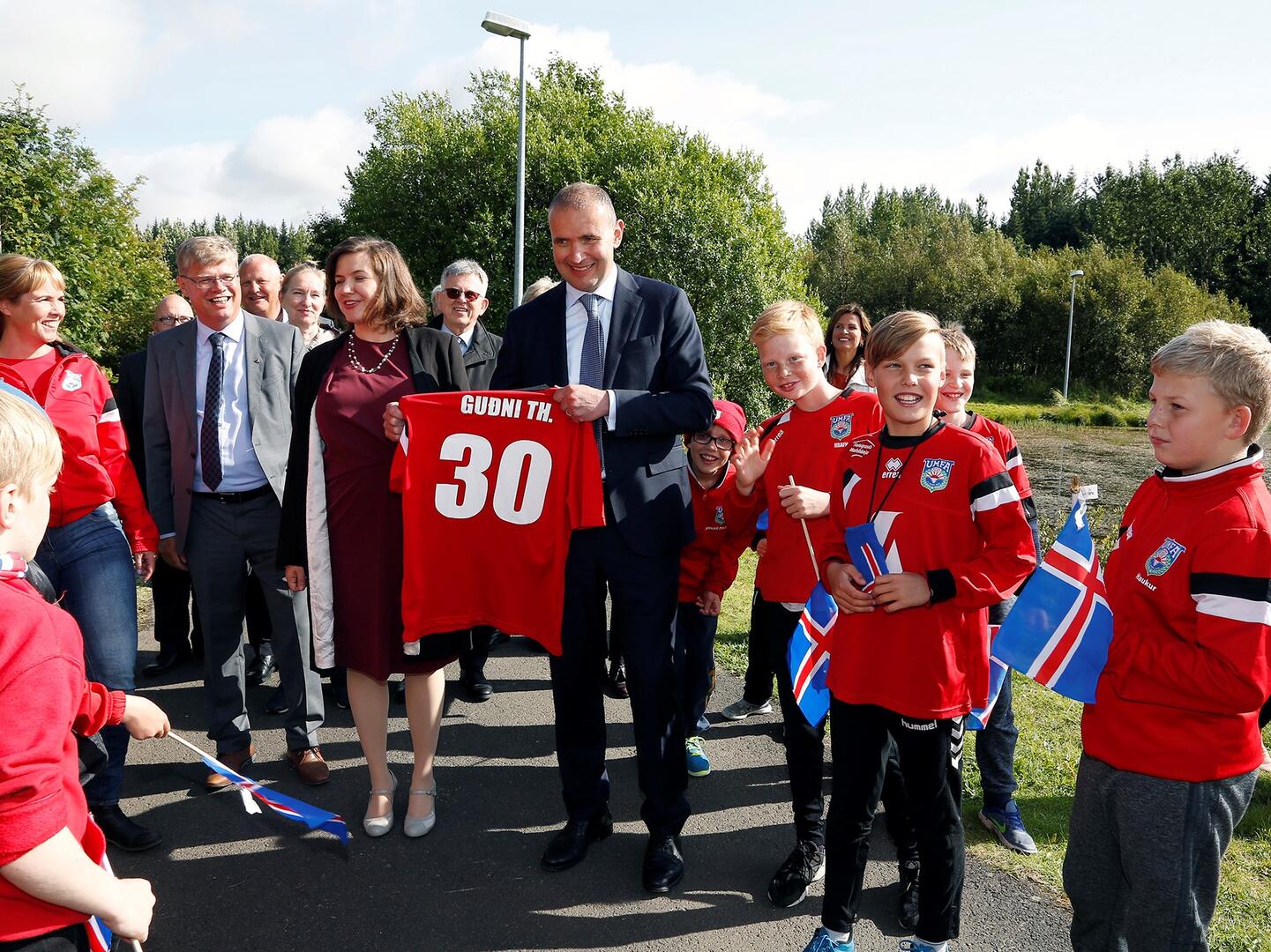 Forseti þiggur búning Ungmennafélagsins Aftureldingar úr hendi ungra liðsmanna félagsins.