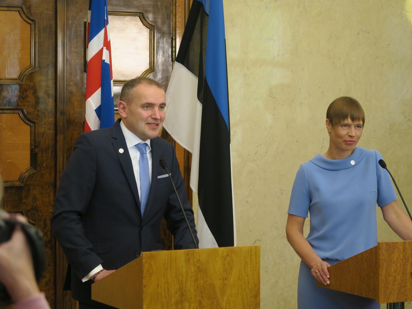 Forsetar Íslands og Eistlands ræða við fréttamenn í Tallinn.