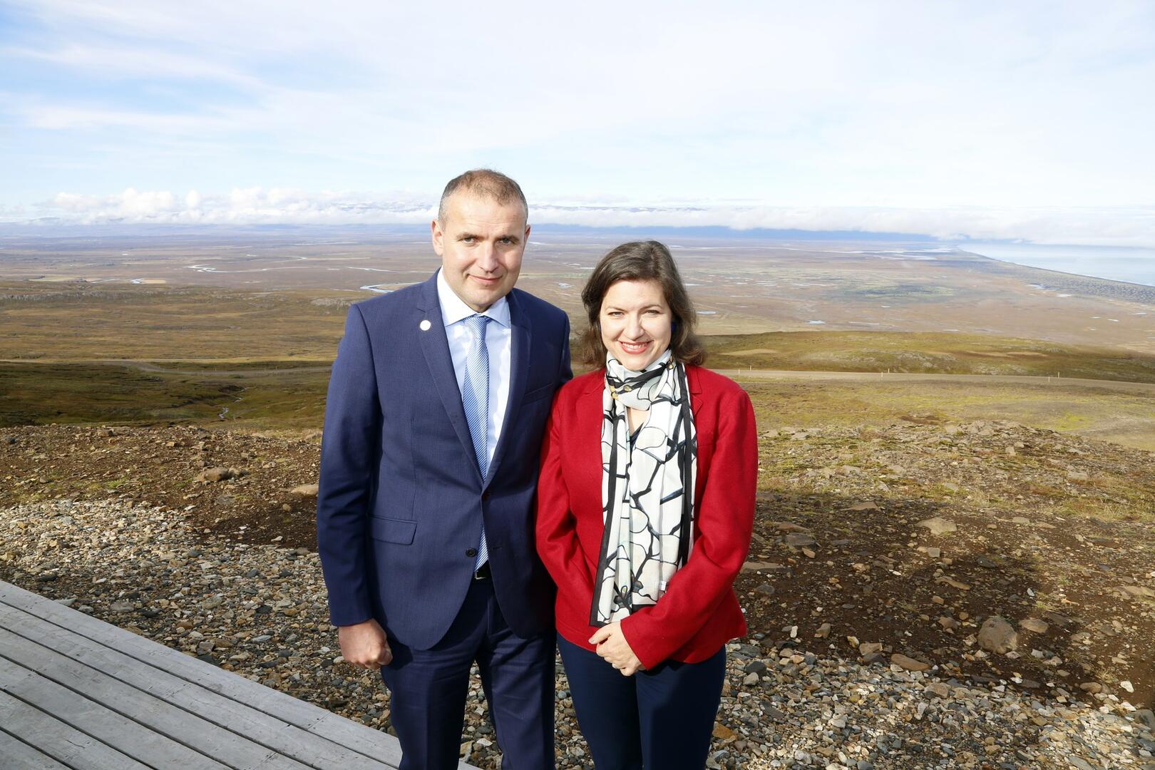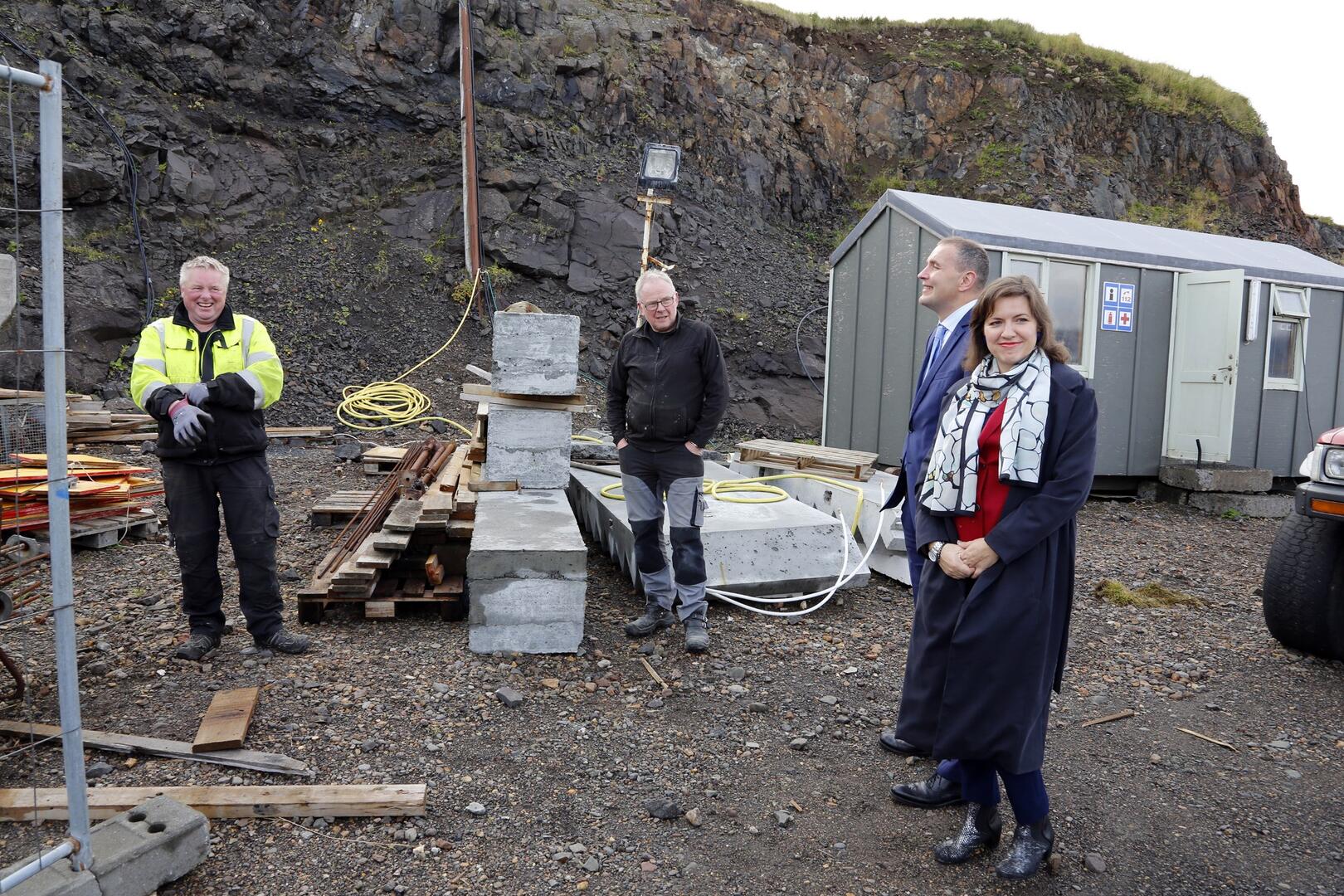 Forsetahjón ásamt Heiði Vigfúsdóttur, framkvæmdastjóra Vök Baths, og Guðmundi Davíðssyni við heitaveitu Egilsstaða og Fella hjá Urriðavatni þar sem unnið er að byggingu nýs útibaðstaðar.