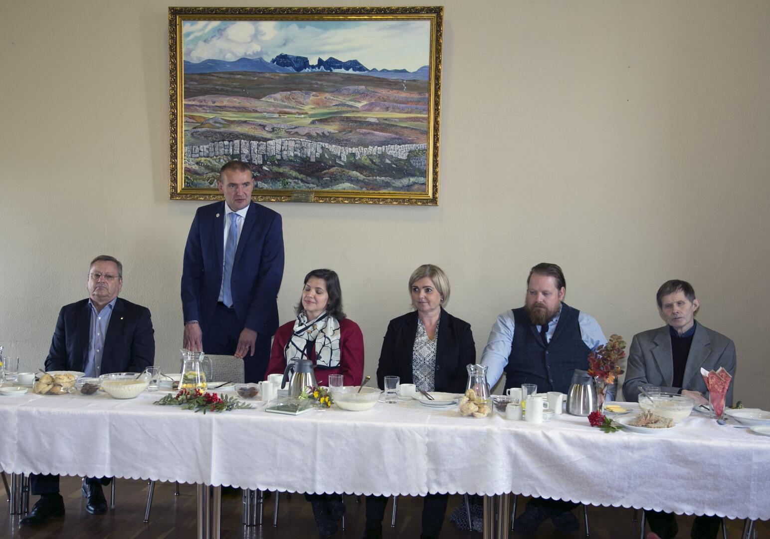Forseti ávarpar gesti í félagsheimilinu Hjaltalundi.