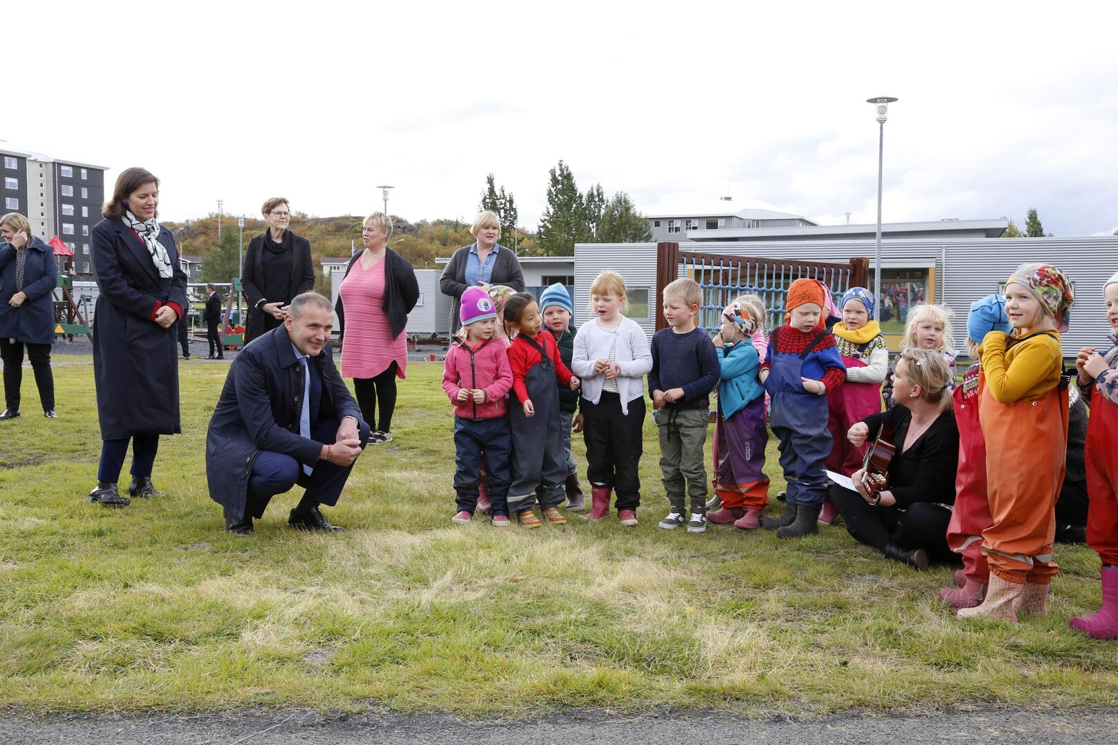 Forsetahjón ásamt leikskólabörnum á Egilsstöðum.