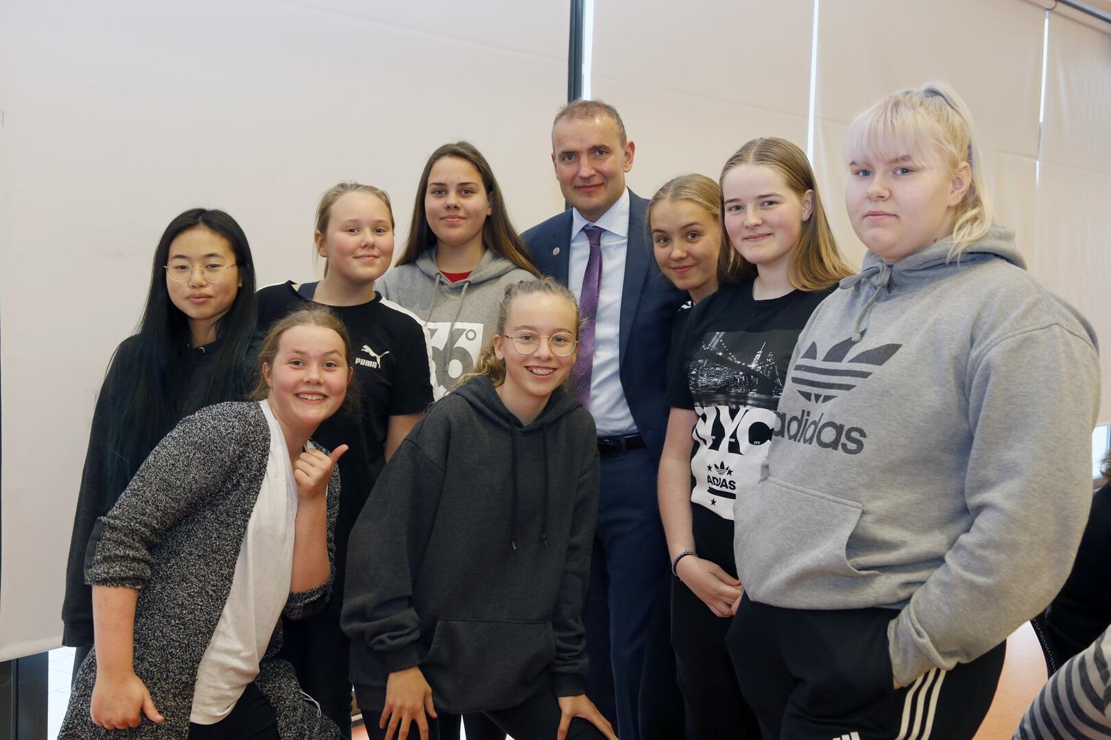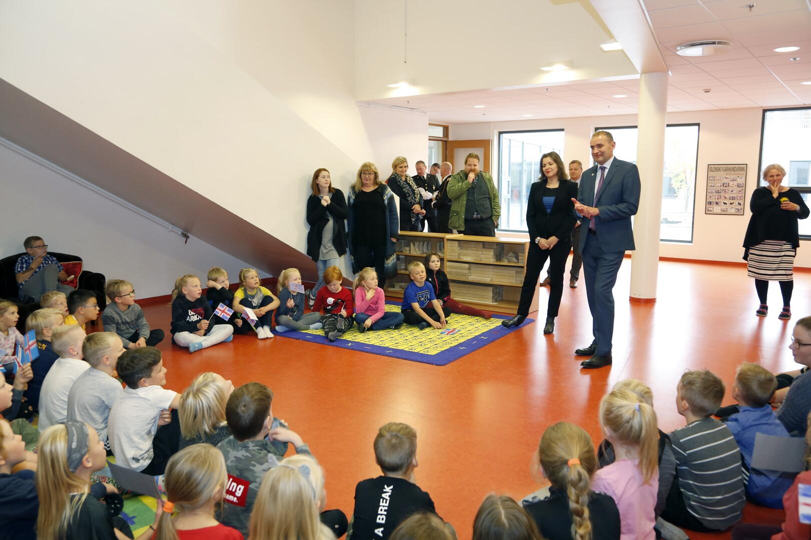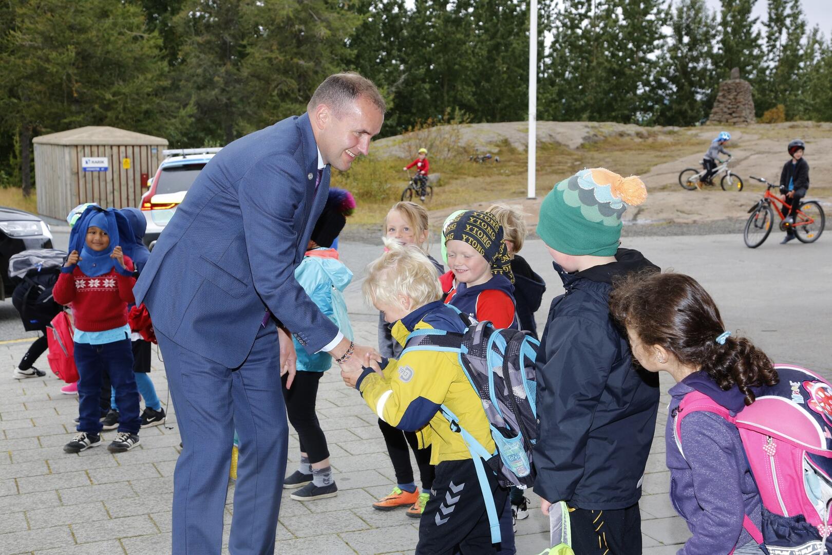 Forseti heilsar upp á börn í grunnskóla Egilsstaða.