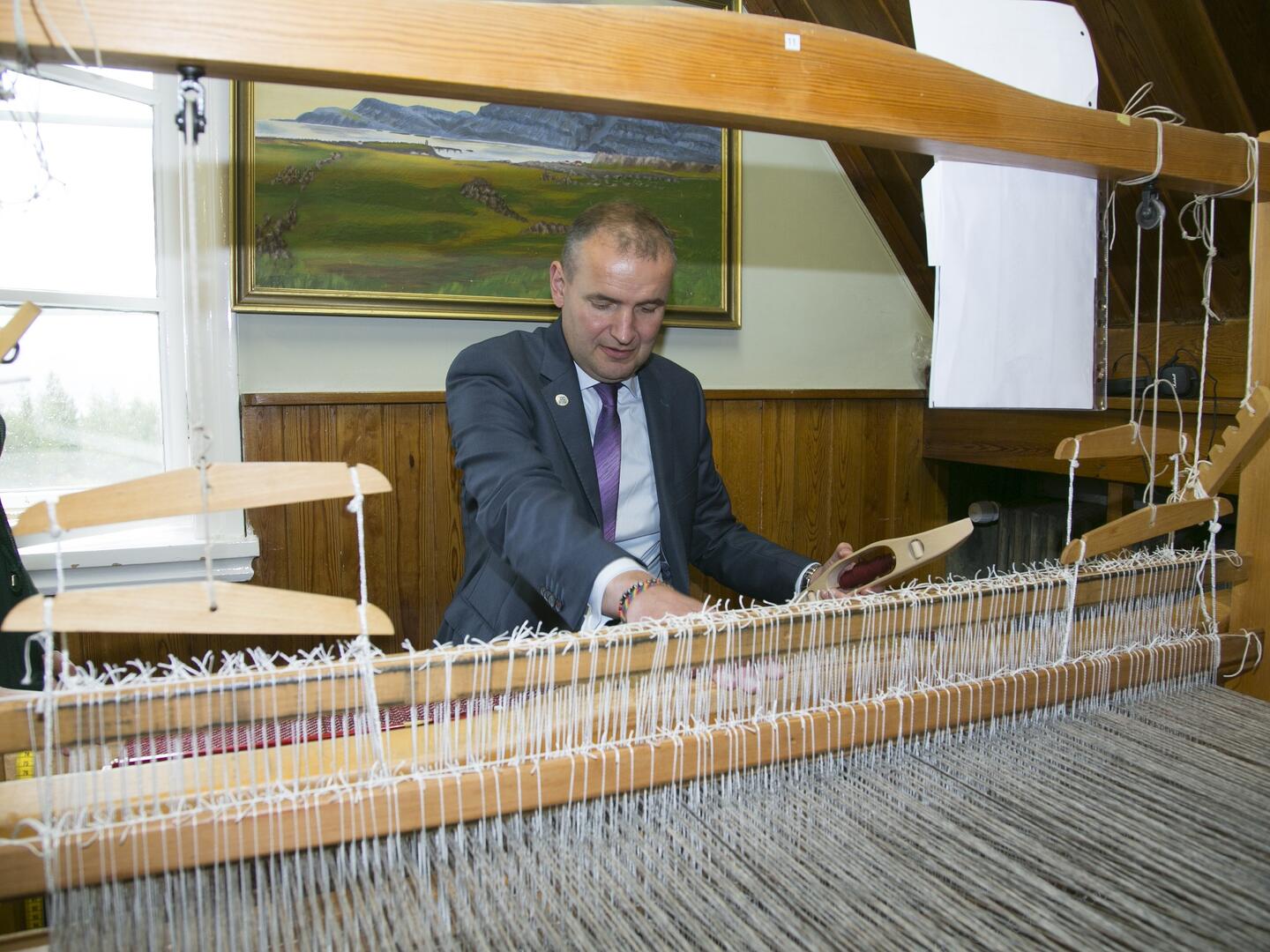 Forseti spreytir sig á vinnu við vefstól á Hallormsstað.
