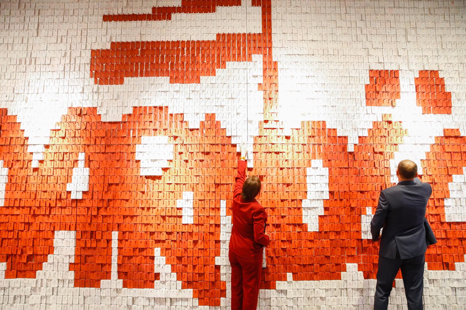 The President and the first Lady add a label with their thoughts to the collection in the European Solidarity Centre in Gdańsk. (Photo: Wojtek Figurski).
