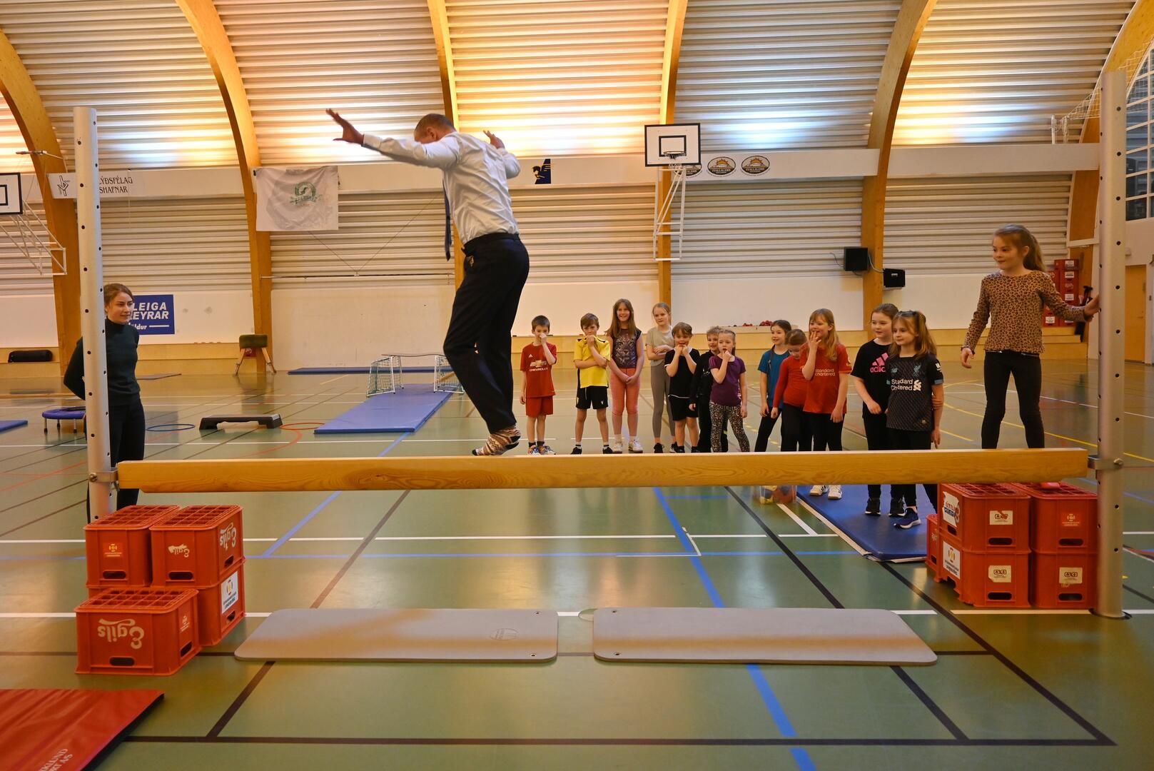 Forseti tekur þátt í þrautabraut í íþróttakennslu við Grunnskólann á Þórshöfn. Ljósmynd/Una Sighvatsdóttir