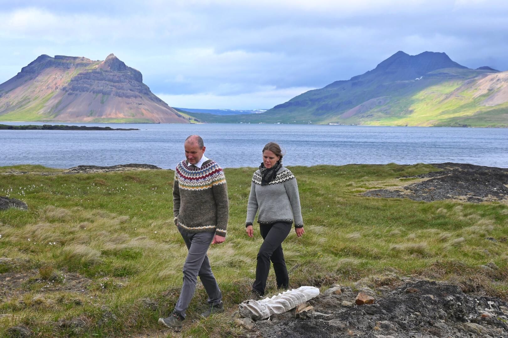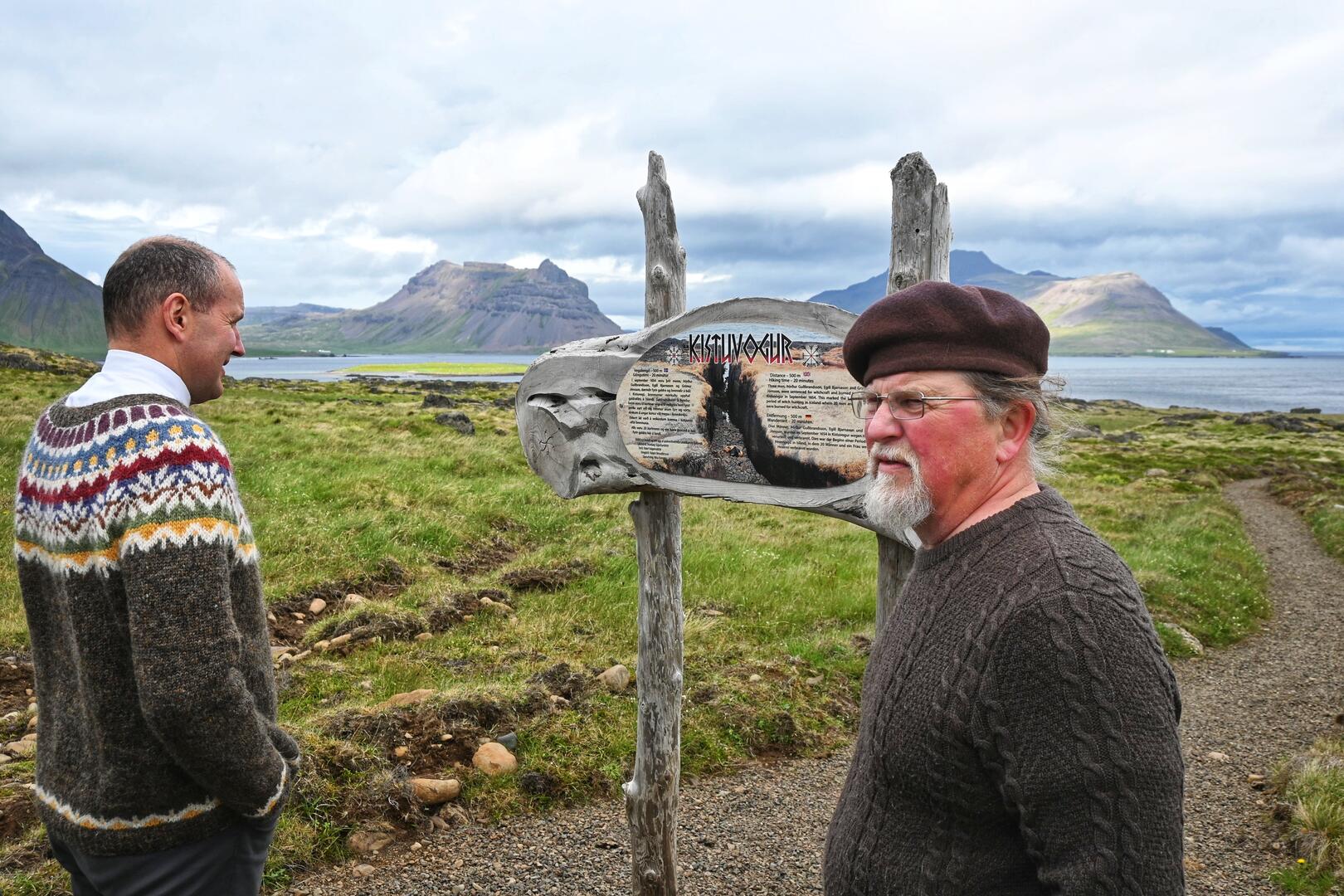 Guðjón Stefán Kristinsson skrúðgarðyrkjumeistari leiðsegir forseta um Galdrstíg sem liggur að Kistuvogi í Trékyllisvík. Ljósmynd/Una Sighvatsdóttir