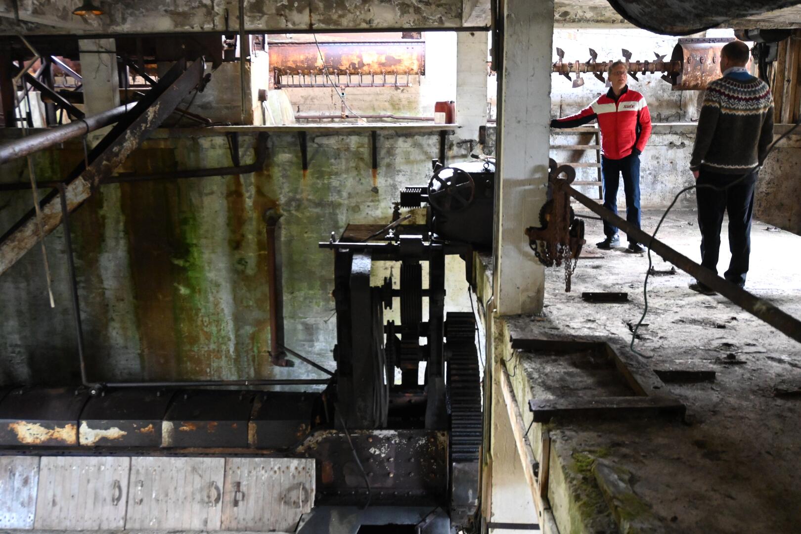 Skoðunarferð um síldarverksmiðjuna á Eyri við Ingólfsfjörð undir leiðsögn Guðjóns Ingólfs Egilssonar. Ljósmynd/Una Sighvatsdóttir