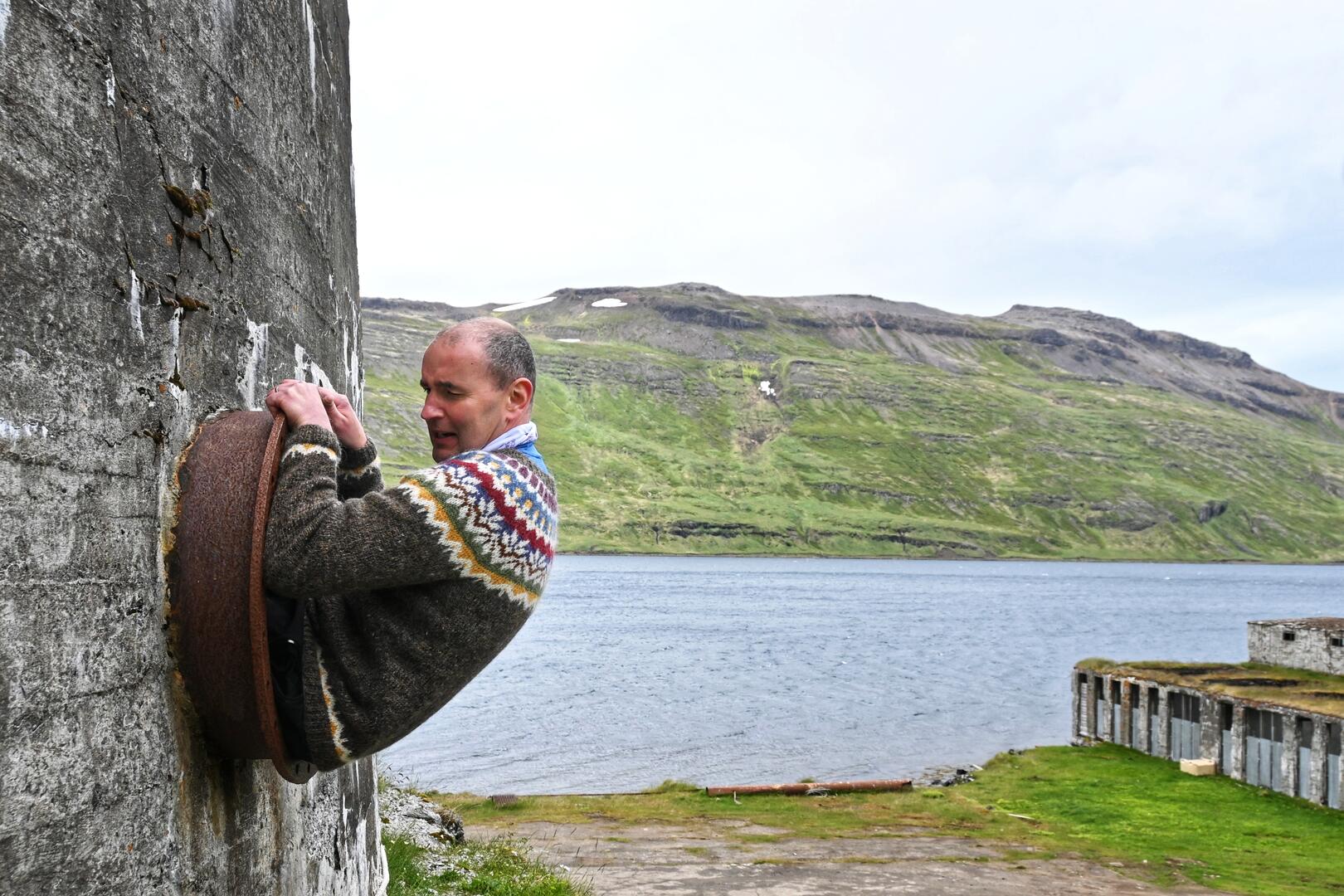 Olíutankur síldarverksmiðjunnar á Eyri við Ingólfsfjörð skoðaður. Ljósmynd/Una Sighvatsdóttir.