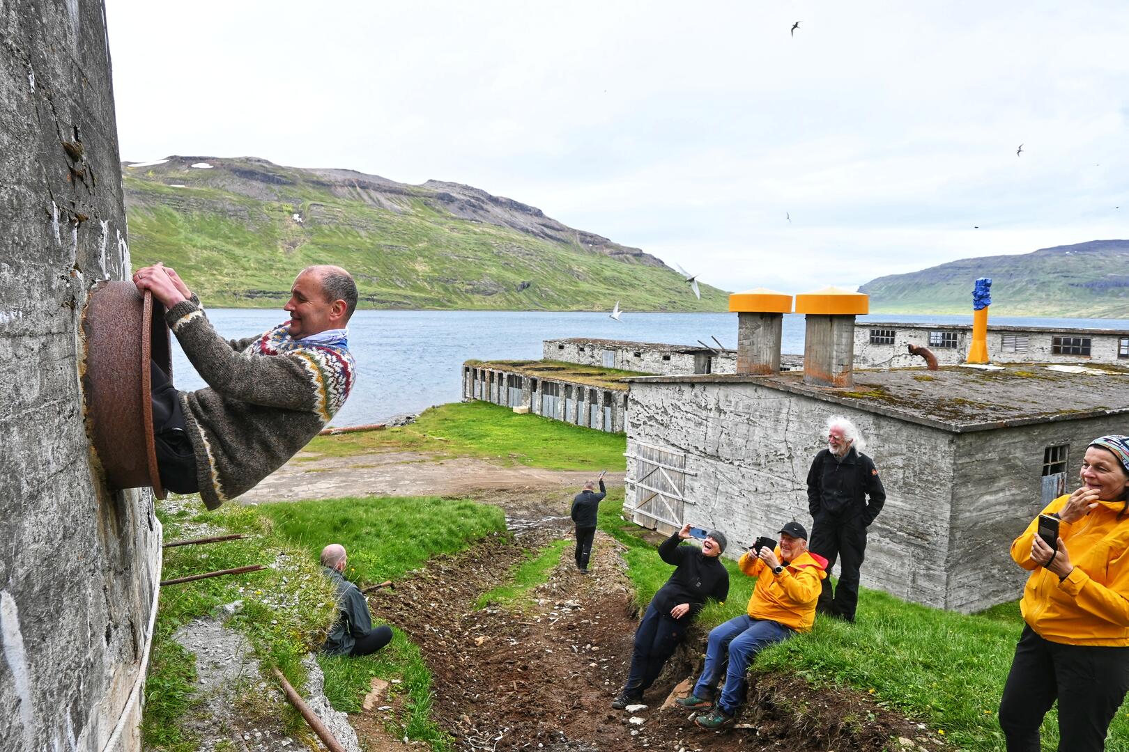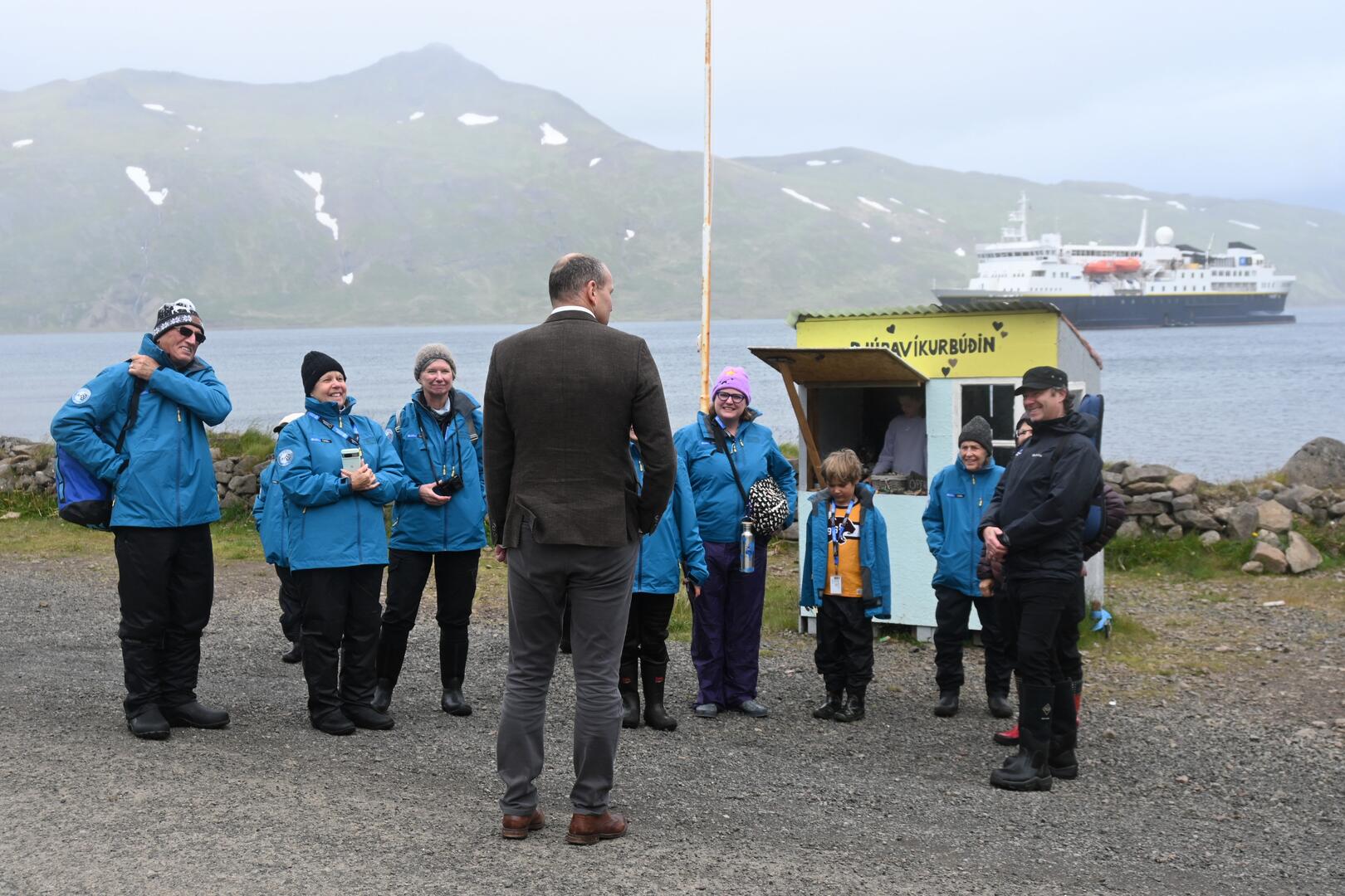 Forseti ræðir við erlenda ferðamenn úr skemmtiferðaskipi National Geographic á Djúpavík. Ljósmynd/Una Sighvatsdóttir