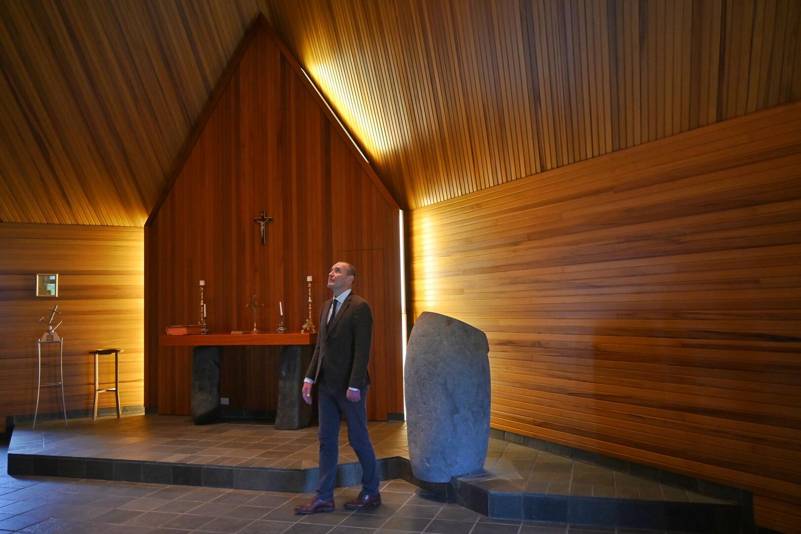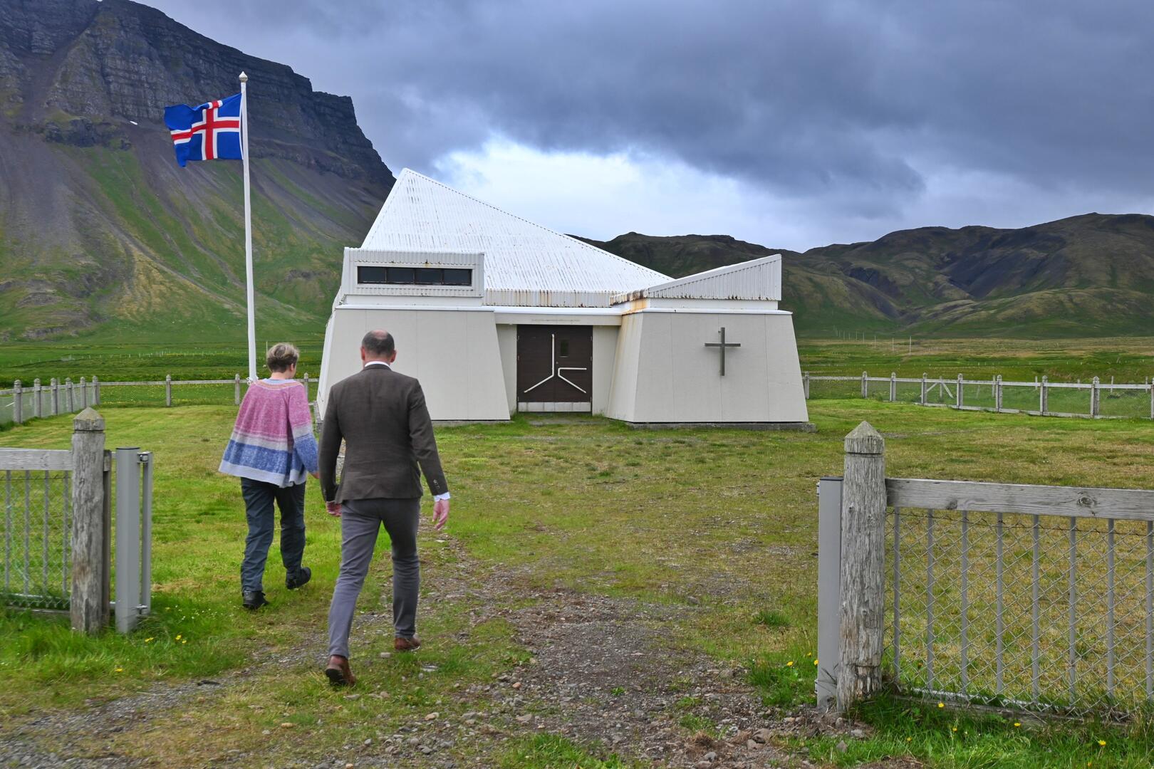 Forseti heimsækir nýju kirkjuna í Árnessókn. Kirkjan er teiknuð af Guðlaugi Gauta Jónssyni arkitekt og var vígð árið 1991. Ljósmynd/Una Sighvatsdóttir