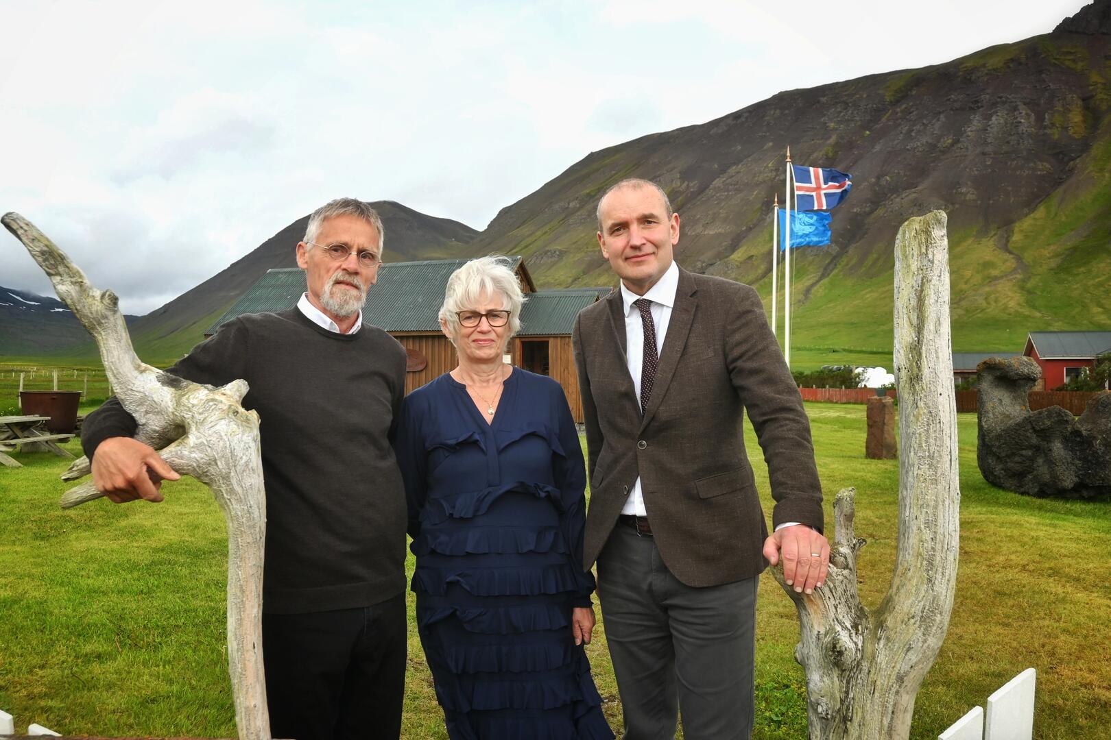 Valgeir Benediktsson og Hrefna Þorvaldsdóttir taka á móti forseta við Minja- og handverkshúsið Kört í Trékyllisvík. Ljósmynd/Una Sighvatsdóttir