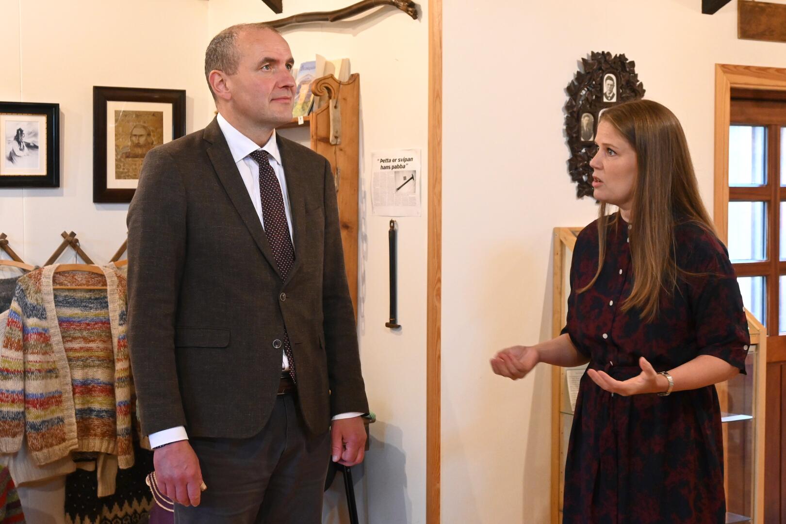 Rakel Valgeirsdóttir þjóðfræðingur fræðir forseta um safnkost Minja- og handverkshússins Kört í Trékyllisvík. Ljósmynd/Una Sighvatsdóttir