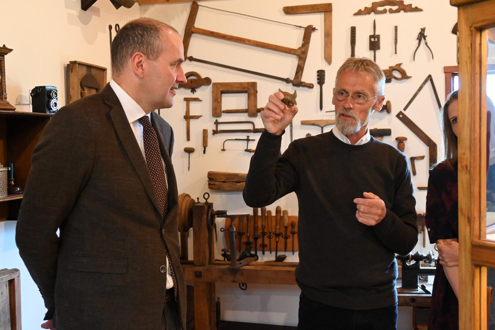 Valgeir Benediktsson fræðir forseta um safnkost Minja- og handverkshússins Kört í Trékyllisvík. Ljósmynd/Una Sighvatsdóttir
