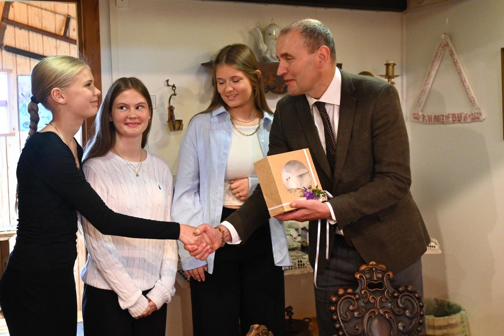 Forseta færð gjöf í lok heimsóknar í Minja- og handverkshússins Kört. Gjöfin var útskorin rjúpa eftir Valgeir Benediktsson. Ljósmynd/Una Sighvatsdóttir