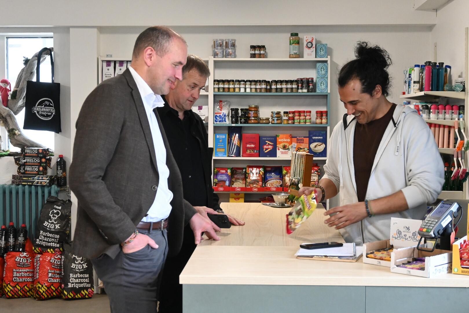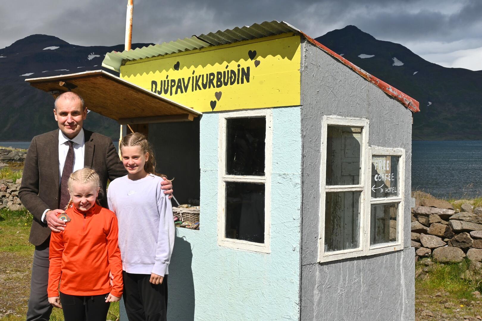 Forseti ásamt afgreiðslustúlkum Djúpavíkurbúðarinnar. Ljósmynd/Una Sighvatsdóttir