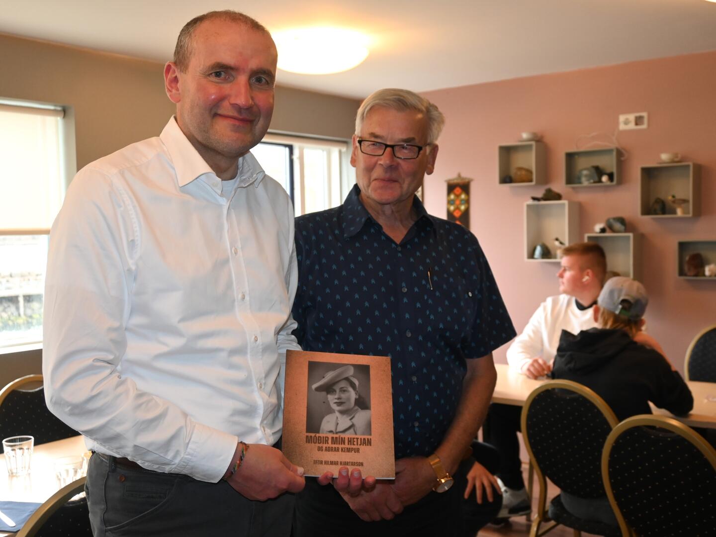 Strandamaðurinn Hilmar Hjartarson færir forseta bók um barnsnauðir á Ströndum, á Kaffi Norðurfirði. Ljósmynd/Una Sighvatsdóttir