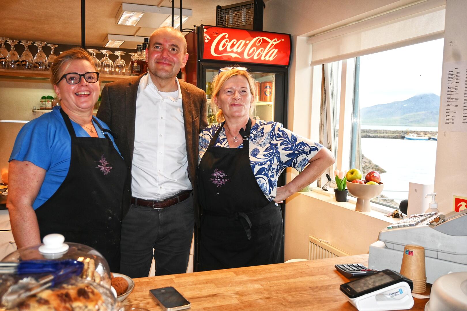 Gíslína Vilborg Gunnsteinsdóttir og Unnur Pálína Guðmundsdóttir ásamt forsetas á Kaffi Norðurfirði. Ljósmynd/Una Sighvatsdóttir