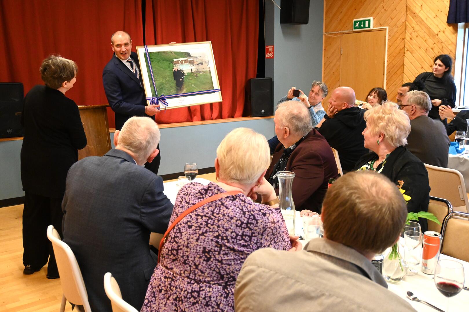 Forseti heilsar íbúum Árneshrepps í kvöldverði honum til heiðurs sem haldinn var í félagsheimilinu í Trékyllisvík. Ljósmynd/Una Sighvatsdóttir