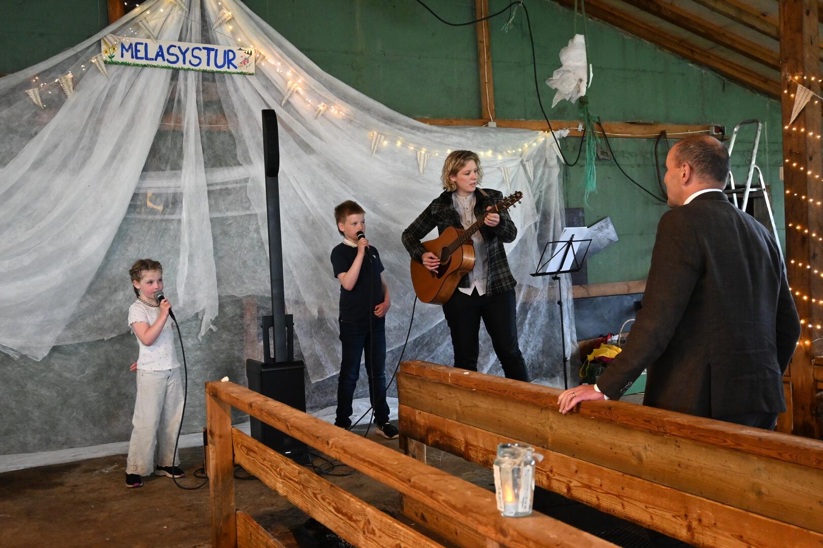 Afkomendur bændanna á Melum í Trékyllisvík syngja fyrir forseta í fjárhúsinu þar sem útihátíðini Nábrókin fer fram um verslunarmannahelgi. Ljósmynd/Una Sighvatsdóttir