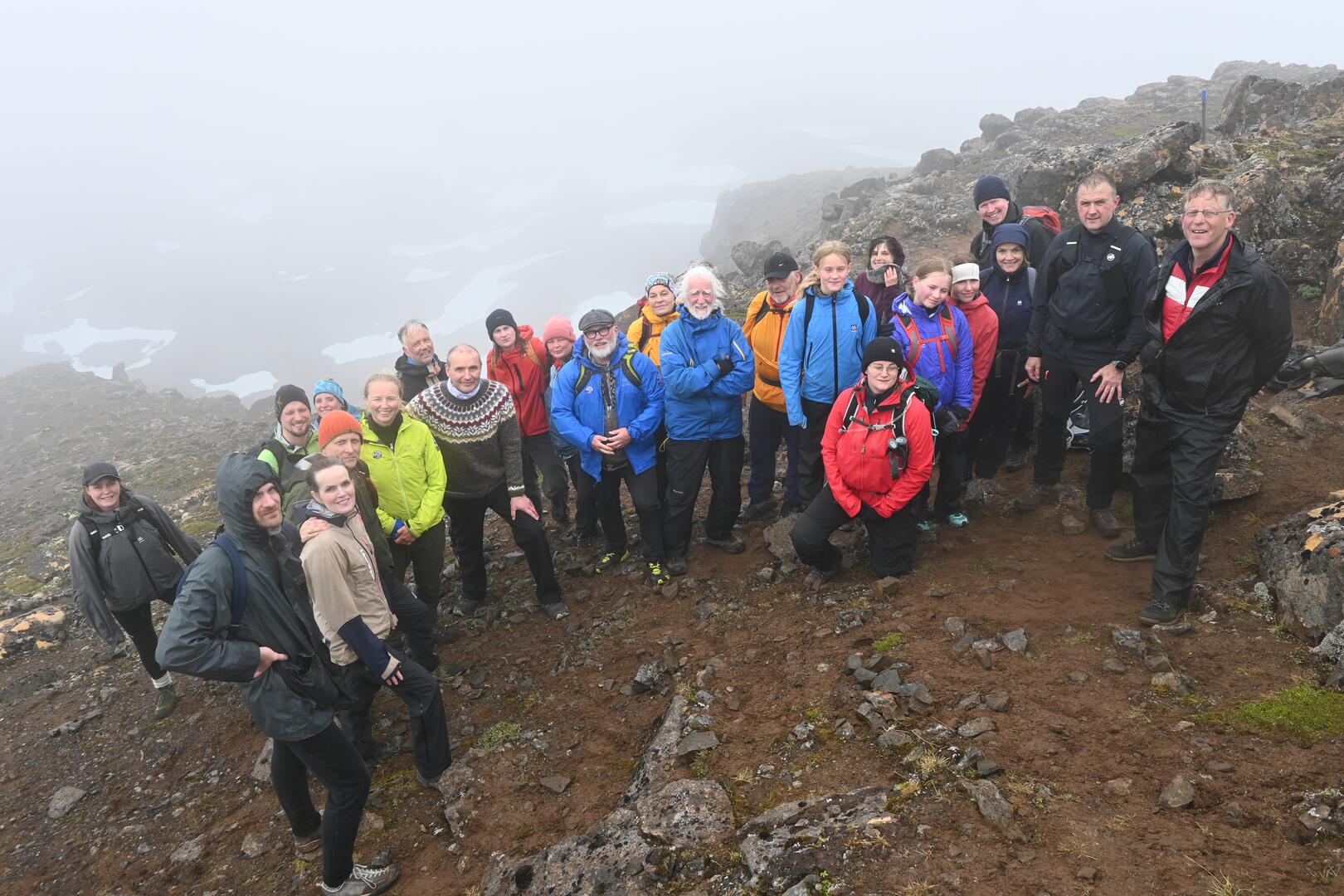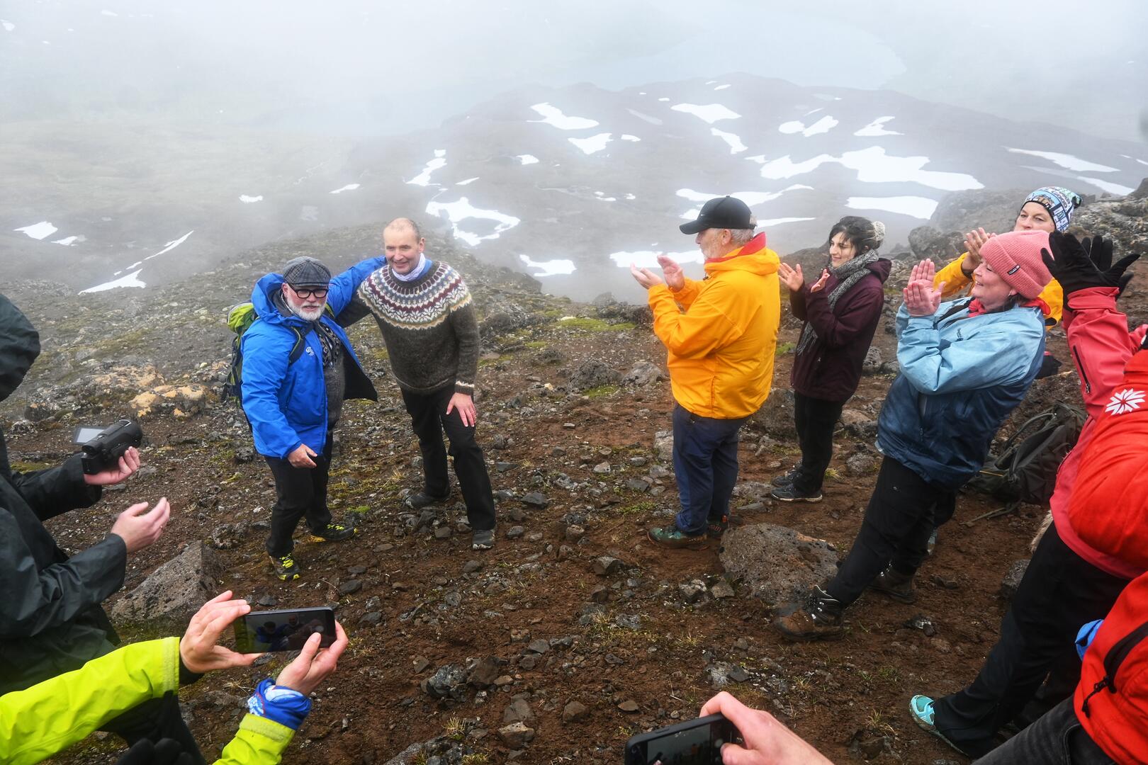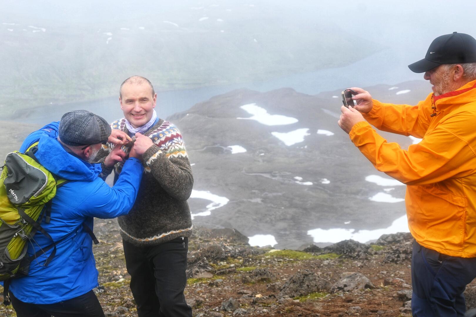 Páll Guðmundsson, framkvæmdastjóri FÍ, sæmir forseta gullmerki félagsins á toppi Glissu. Ljósmynd/Una Sighvatsdóttir