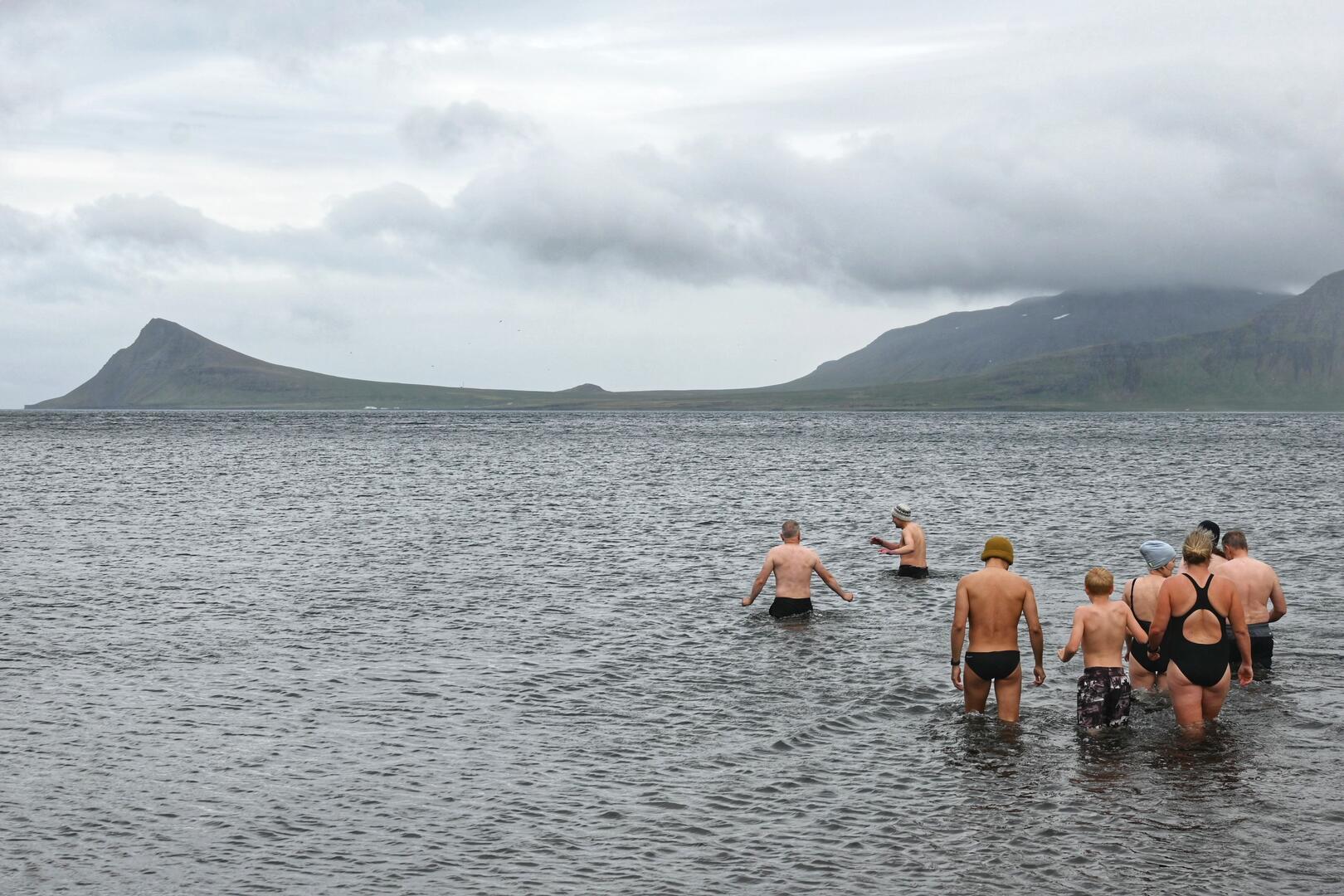 Forseti leiðir sjósundshóp í Norðurfirði á Ströndum. Ljósmynd/Una Sighvatsdóttir.