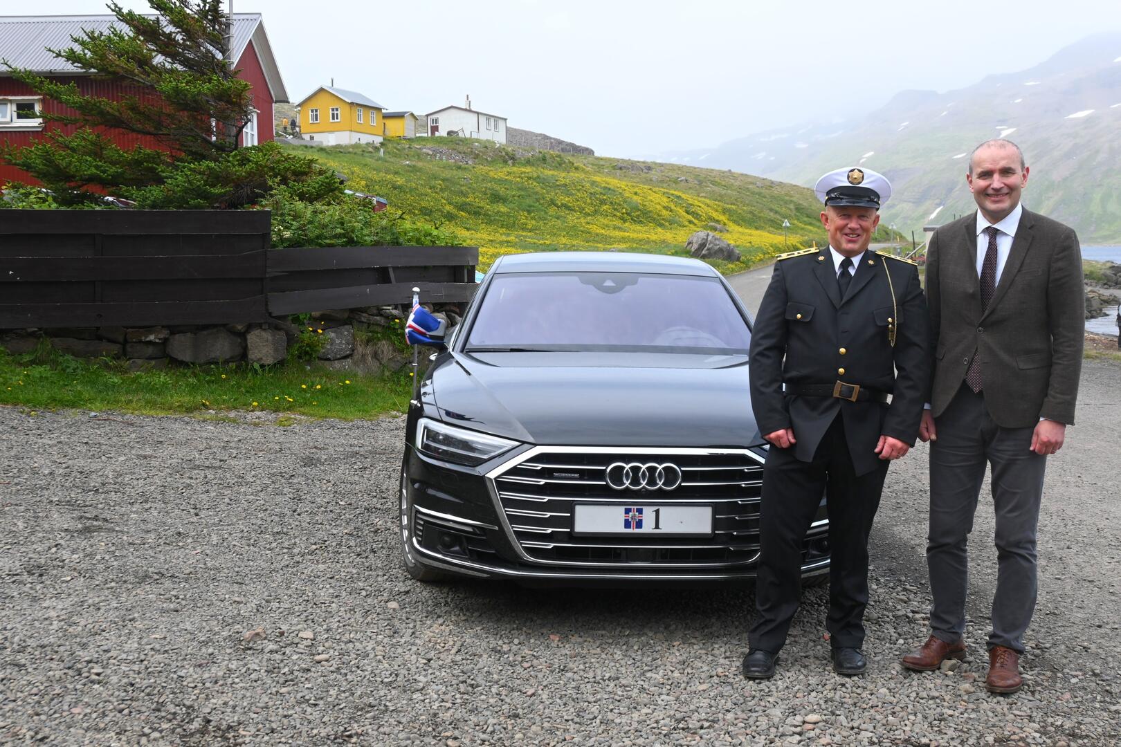 Atli Árdal Ólafsson, lögregluvarðstjóri á Hólmavík, ásamt forseta á Djúpavík. Ljósmynd/Una Sighvatsdóttir