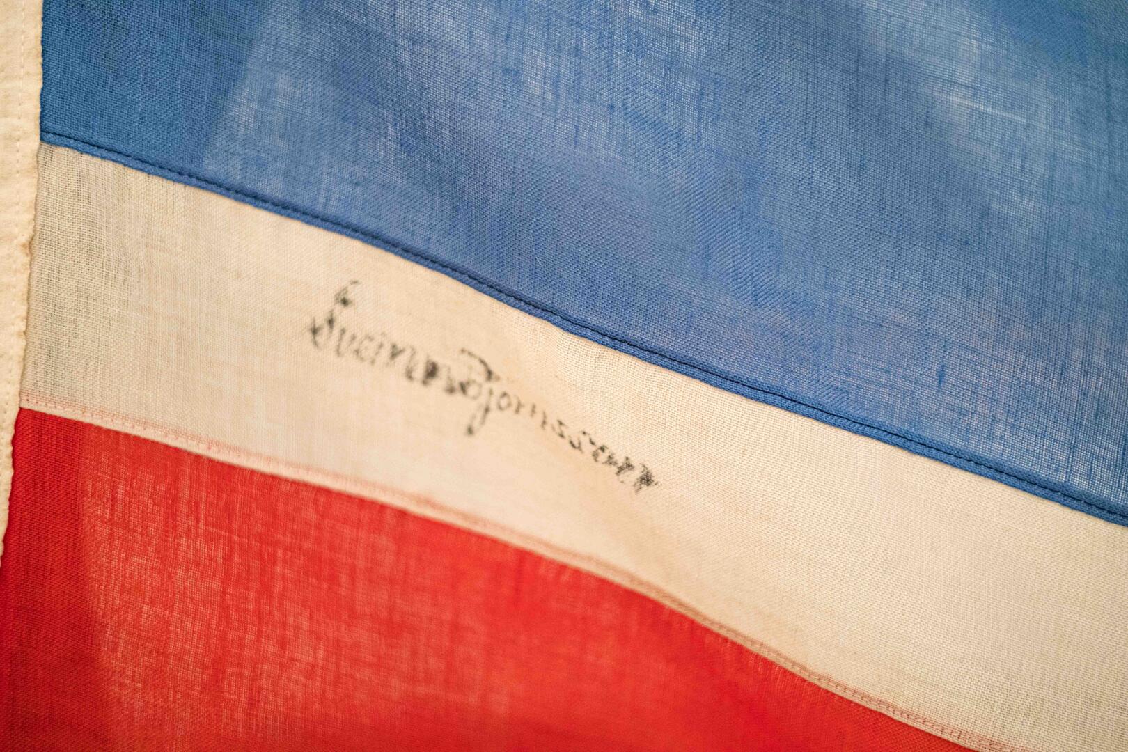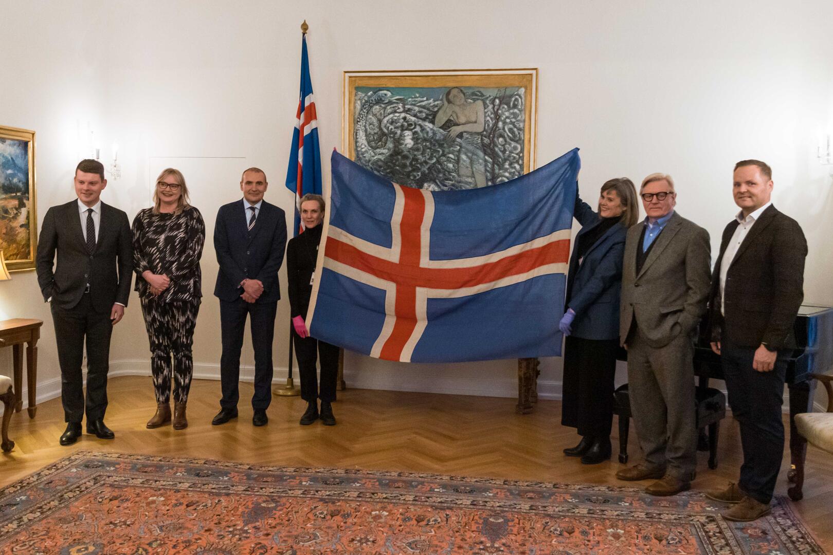 Fyrir nokkru var fáninn boðinn upp á uppboðshúsi í Kaupmannahöfn. Vinafélag Þjóðminjasafnsins, Minjar og saga, átti hæsta boð, hreppti fánann og flutti til Íslands sumarið 2021 með stuðningi Eimskipafélags Íslands.