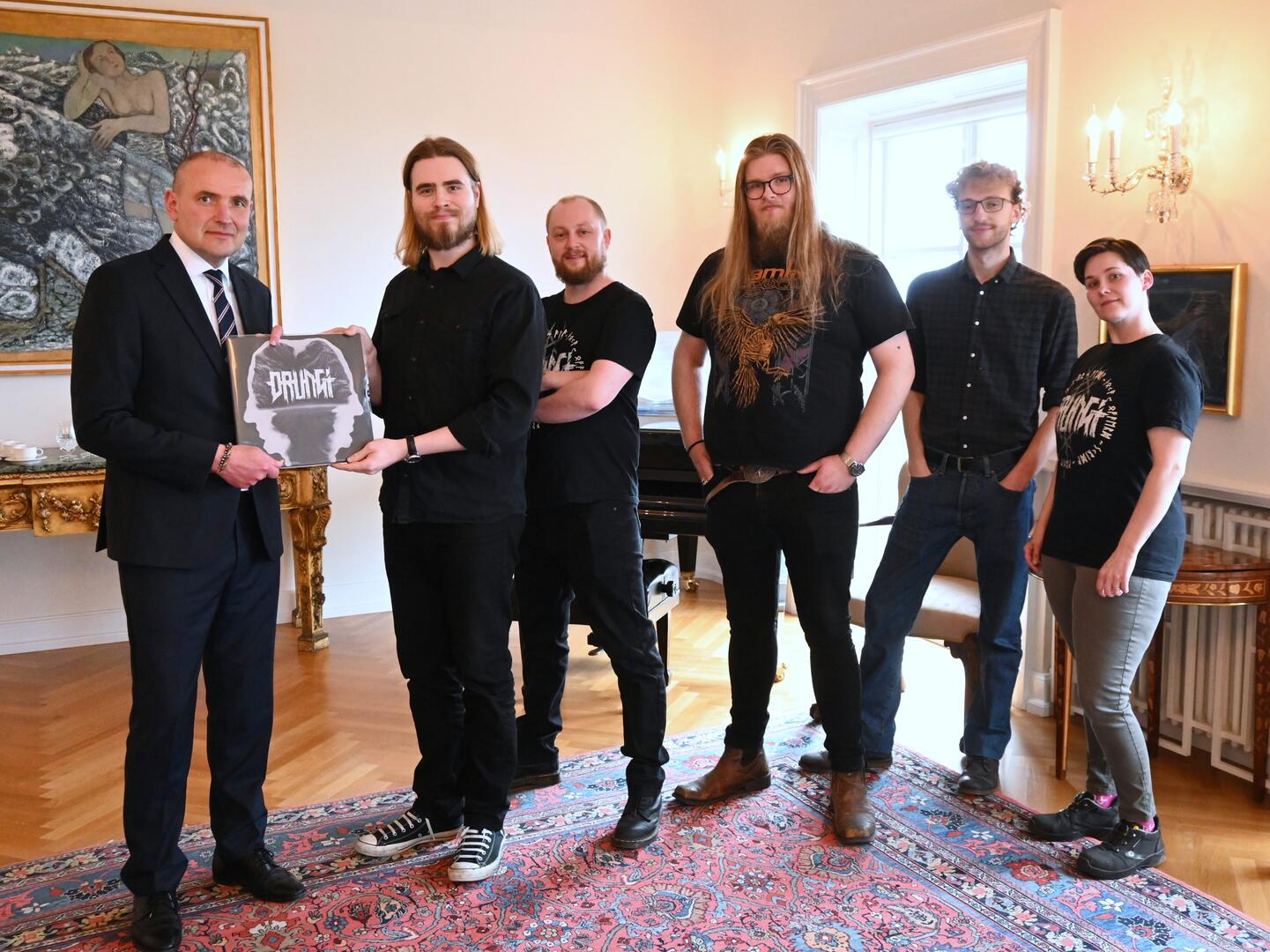 • Liðsmenn þungarokkssveitarinnar Drungi þáðu kaffi á Bessastöðum og afhentu um leið nýja plötu sína, Hamfarir hugans.