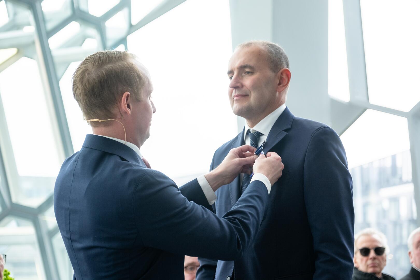 • Aríel Pétursson, formaður Sjómannadagsráðs, sæmir forseta heiðursmerki á sjómannadaginn. Ljósmynd: Ernir Eyjólfsson.